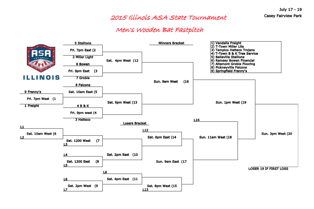 The Illinois Amateur Softball Association 2015 mens tournament schedule kicks off this weekend with the Mens Wooden Bat tournament in Casey, Illinois. An induction ceremony will take place at 6:30pm at the East Stadium followed by the first two games, one game will take place at the East Stadium the other game at the West Stadium. Here is the bracket for the Mens Wooden Bat Tournament.