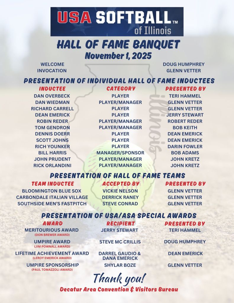 Each year the USA Softball of Illinois honors those people who have played a key role in the development of the game of softball as one of America’s greatest sports. To be selected for the Illinois State Hall of Fame, it is recommended a person or team must meet the criteria to be eligible for the Hall of Fame. Congratulations to the following individuals and teams on your induction to the USA Softball of Illinois Hall of Fame. A specially designed plaque shall be given to those selected by the Illinois State USA Hall of Fame Committee and an engraved nameplate will be added to the wall at the museum in Casey, IL. Click here to view the entire list of Hall of Fame inductees going back to 1971.