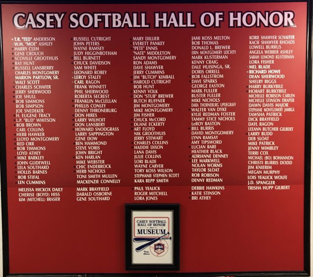 Central Illinois has always been a leader in fastpitch softball activities. Casey in particular has been active in promotion and recognition of the game. A softball program has been in continuous operation since the early 1930’s. In 1982 a Fast Pitch Hall of Honor committee was selected with the approval of the Illinois Amateur Softball Association. The purpose is to select people who have made outstanding contributions as a player, umpire, sponsor, commissioner, announcer, sports writer, sportscaster, manager or other official designation. Currently 141 men and women have been selected for entry into The Casey Softball Hall of Honor.