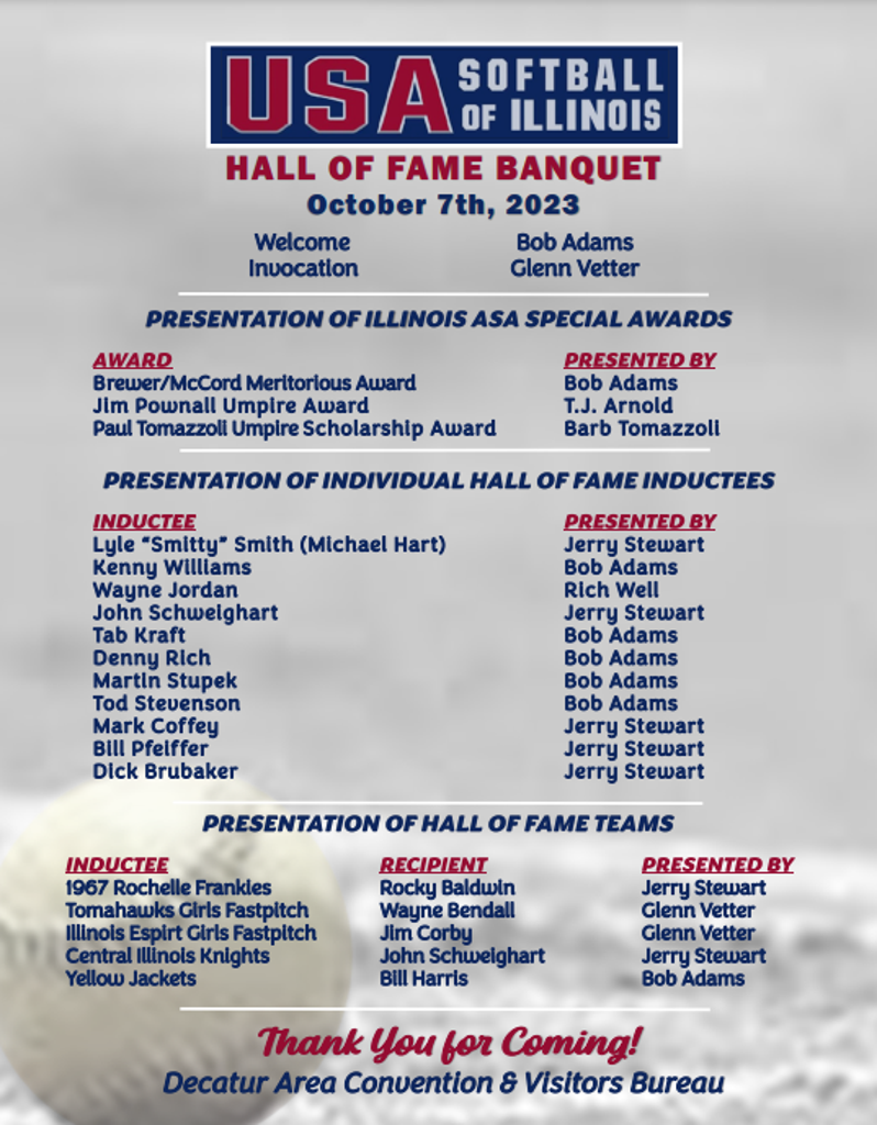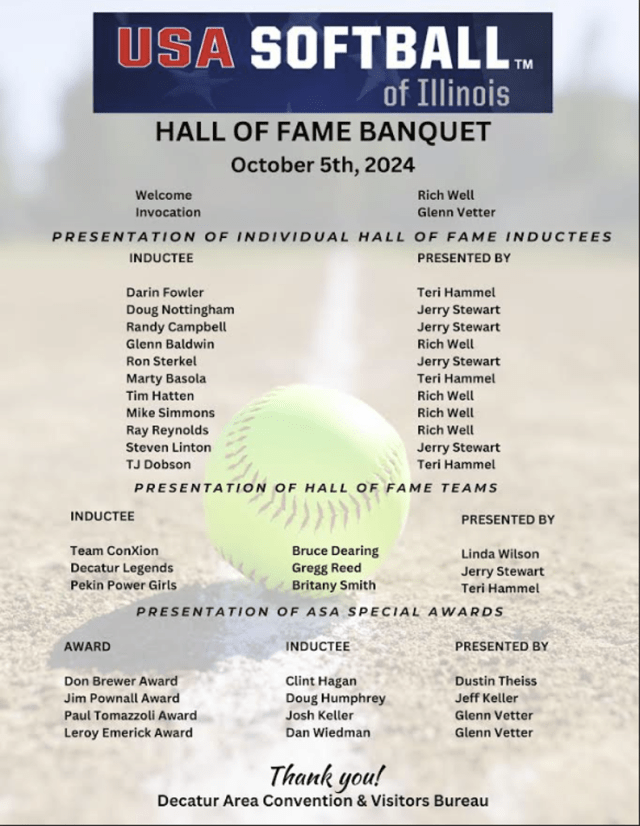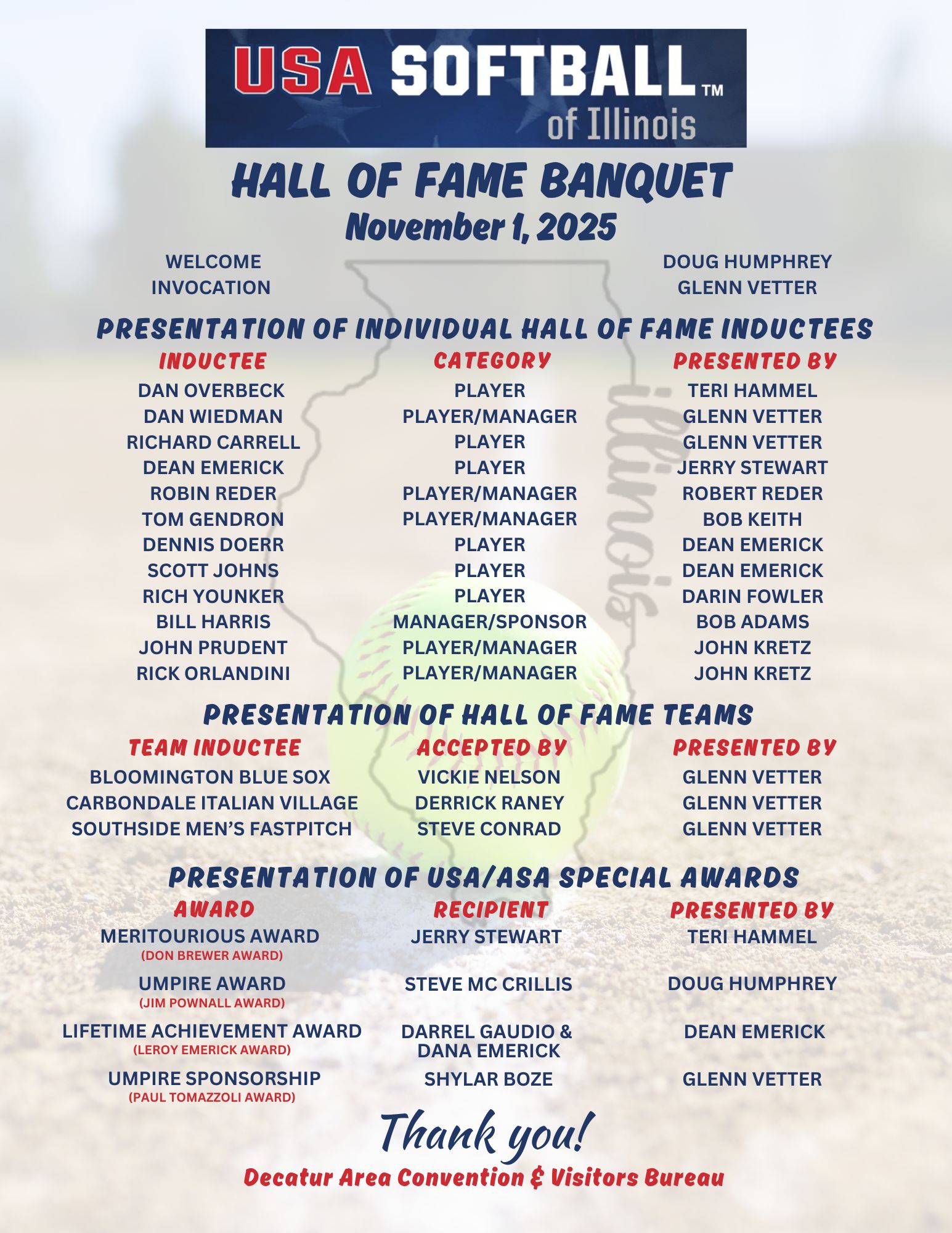 The complete list of Hall of Fame inductees is available on the USA Softball of Illinois website. Click this link to view the HOF list.