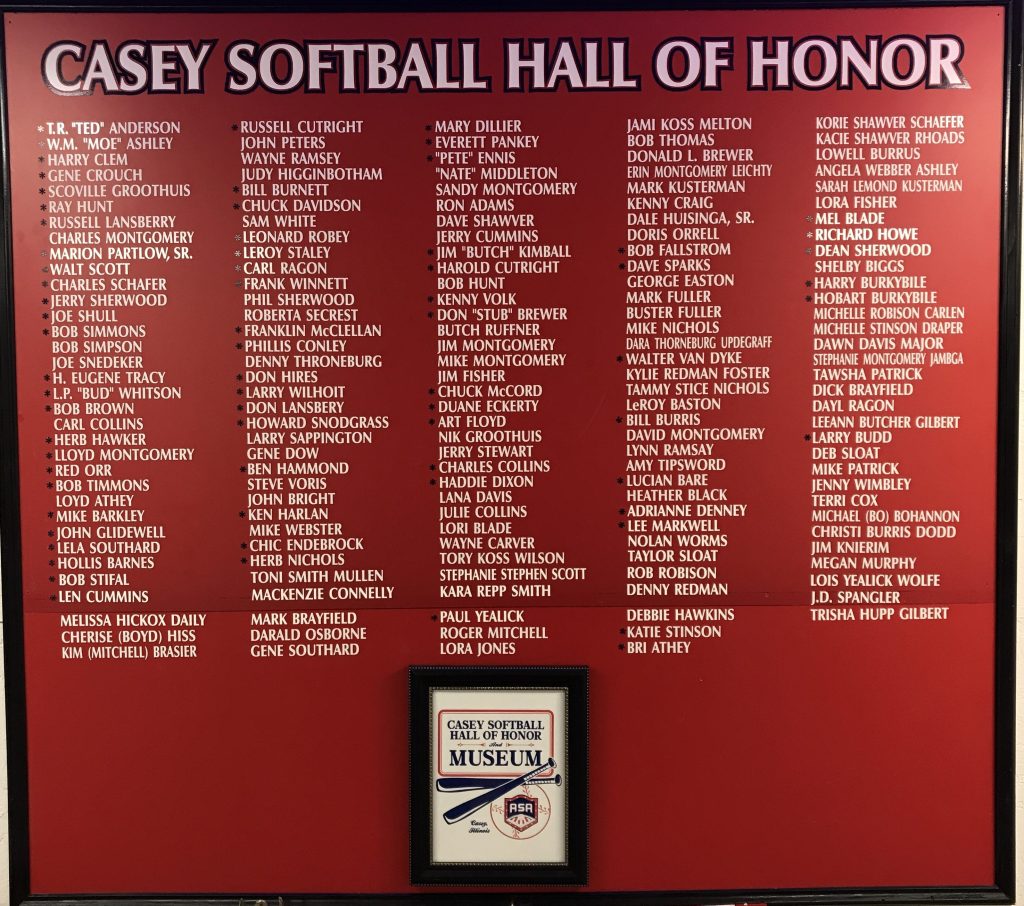 Don Brewer 2012Opening night of the 2012 Mens Wooden Bat State Tournament in Casey, ILMens Wooden Bat Tournament July 28, 20122012 Wooden Bat Tournament 2nd Place Belleville Stallions2012 Wooden Bat Tournament 3rd Place Vandalia Freight2012 Wooden Bat Tournament 1st Place Rockford Blackhawk AC2013 Casey Hall of Honor Inductees2013 Wooden Bat Finals 3rd Place: Vandalia The Freight2013 Wooden Bat Finals 2nd Place: Belleville Stallions2013 Wooden Bast Finals 1st Place: Rockford Blackhawk Athletic ClubA new fence for the museum. November 2013Great catch at Wooden Bat TournamentLeRoy Staley, 79, was born on December 15, 1935 and passed away on Monday, March 2, 2015On April 29, 2011, LeRoy Staley was inducted into the Illinois ASA Hall of Fame for all his years as a team sponsor, specifically the 1980 Women’s State Champion – Casey Stingers. Pickneyville Falcons win the 2015 Mens Wooden Bat Tournament in Casey, IL on July 19, 2015Jay Markwell makes a donation to the museum.Congrats to the Casey-Westfield Junior High Lady Braves Softball Team on their 2016 State Championship!The large wooden bat is added to the museum for a great photo op!Trisha (Hupp) Gilbert, 2018 Casey Hall of FameDeb (Montgomery) Hawkins 2018 Casey Hall of FameMark Brayfield 2018 Casey Hall of FameJ.D. Spangler 2018 Casey Hall of FameMelissa (Hickox) Daily 2018 Casey Hall of FamePaul & Lois Yealick Family 2018 Casey Hall of Famenew cabinetry was recently built and donated to the girls’ portion of the museum by Carroll Stinson.Casey State Bank funds the installation of a new fence at historic Trucker Stadium.Bill Burris Director of the Illinois ASA Softball Museum and a recipient of the Casey Softball Hall of Honor, Oct 6, 1938 – May 2, 20192023 Hall of Fame Banquet: Joe Snedeker and Ray Houck honored.2023 Hall of Fame Banquet: Joe Snedeker with his grandson and son-in-law.2023 Hall of Fame Banquet: Joe Snedeker with museum president Steve Voris.